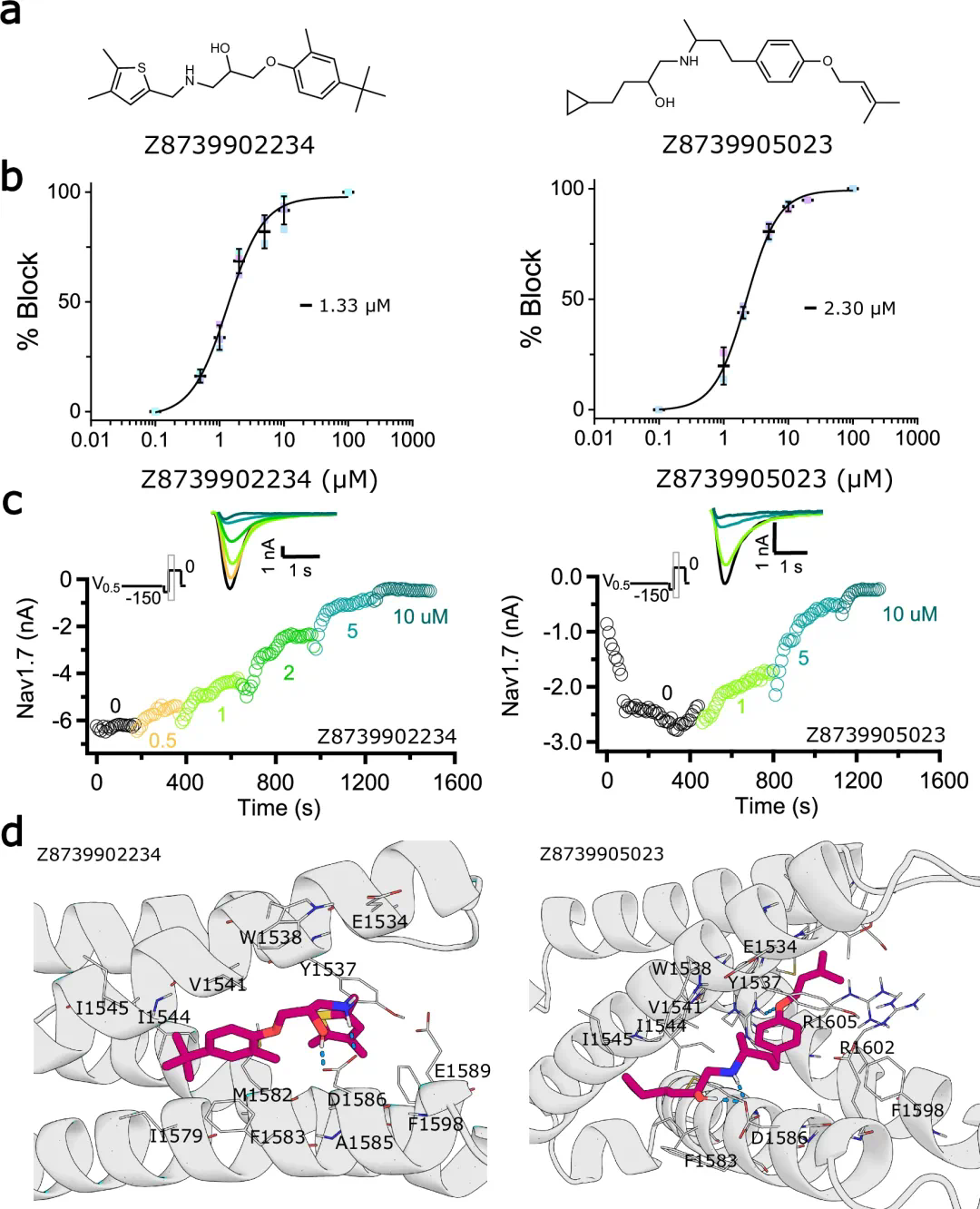 从最初的虚拟筛选活动中,研究人员发现了一种 KLHDC2 化合物(命中率为 14%)和四种 NaV1.7 化合物(命中率为 44%),它们都表现出个位数 µM 的结合亲和力。使用该虚拟筛选平台的重点库,可以发现另外六种与 KLHDC2 具有相似结合亲和力的化合物。