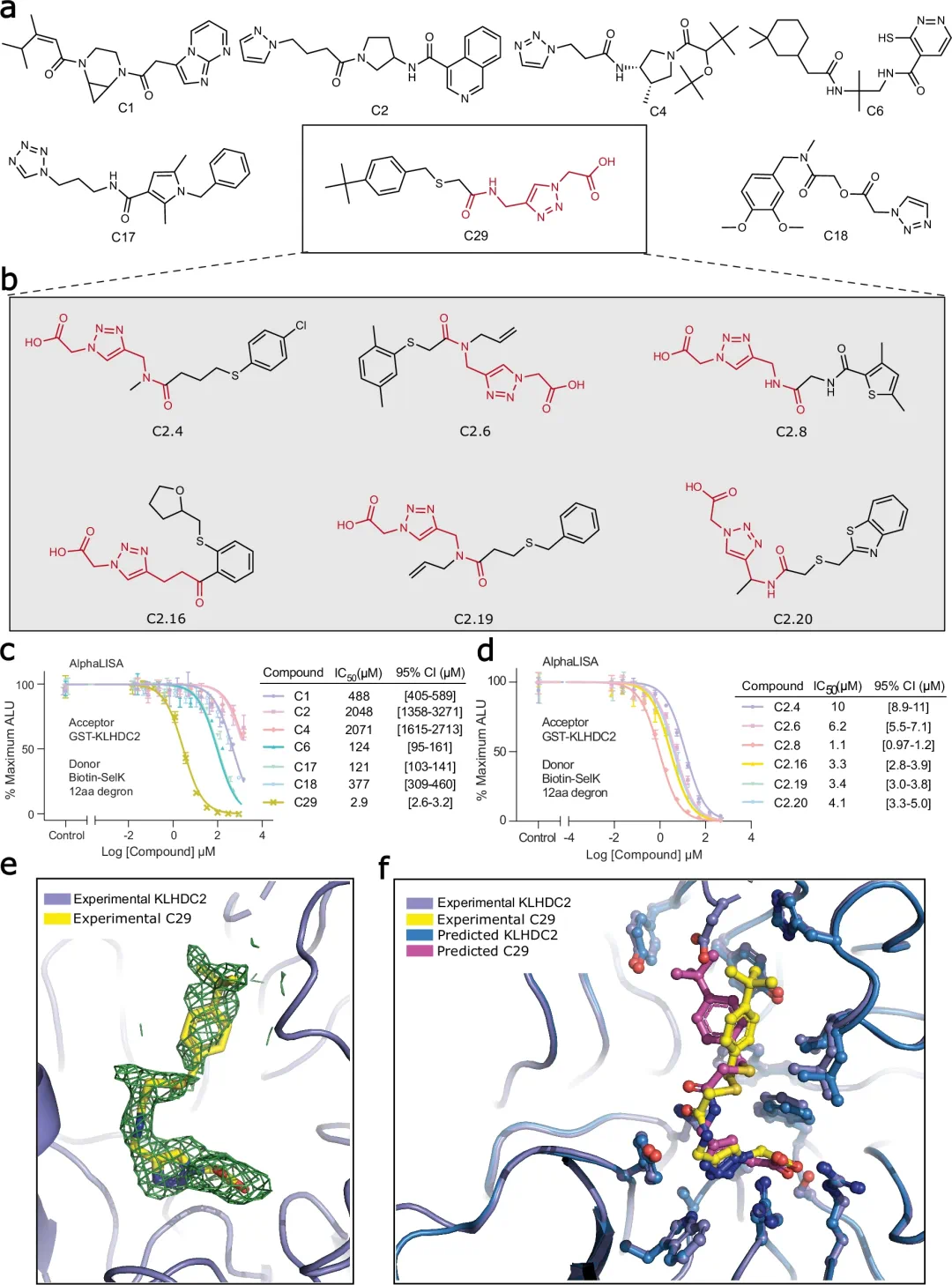 最后,通过 X 射线晶体学验证了 KLHDC2 复合物的对接结构,结果与预测的结合姿势非常一致。这种探索、整理和测试的迭代过程强调了所提方法的稳健性及其在大型分子库中发现有希望的化合物的潜力。