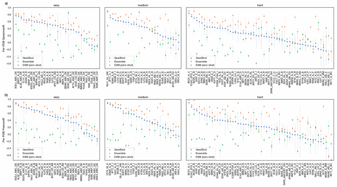 研究人员基于 GearBind 推导出一个强大的集成模型,成功用于增强两种不同抗体的结合能力,实验数据显示设计的抗体突变体显著提升了性能。