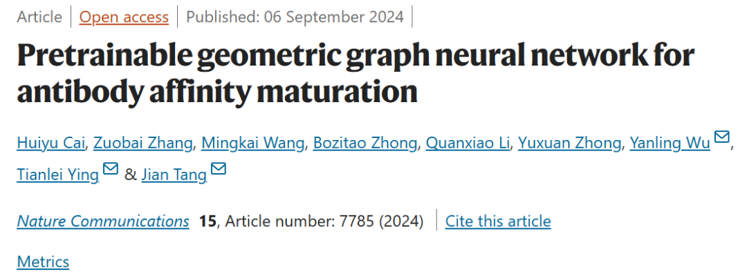 该研究以「Pretrainable geometric graph neural network for antibody affinity maturation」为题,于 2024 年 9 月 6 日发布在《Nature Communications》。