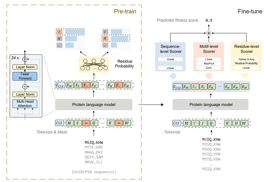 其次,通过使用集成到预训练模型中的三个评分模块预测适应度得分。这些模块(残差级、基序级和序列级)捕获蛋白质序列的不同方面,并结合它们的输出以生成最终的适应度得分。该模型使用已知的适应度数据进行训练,最大限度地减少预测分数和实际分数之间的误差。