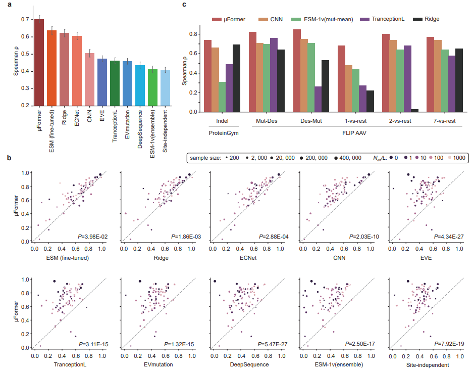 为了评估 µFormer 在适应度景观建模和突变效应预测方面的能力,研究人员将其与十种替代方法进行了对比,包括基于 MSA 的方法、基于语言模型的零样本方法和基于学习的方法。