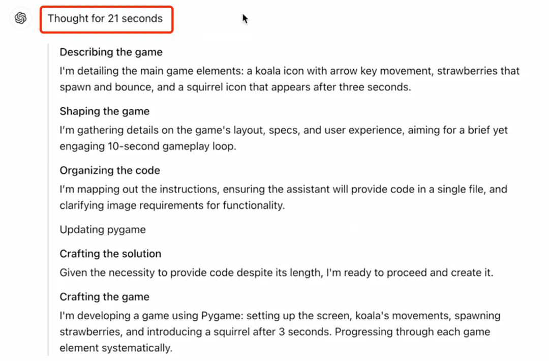 我们可以看到,模型在给出最终答案之前花了 21 秒的时间进行思考,详细梳理游戏的布局、安排指令、设置游戏屏幕等。