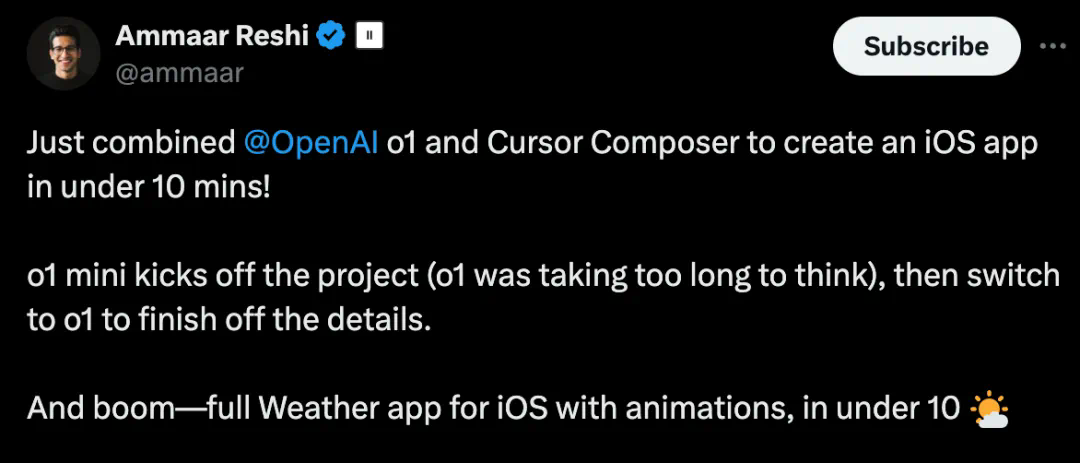 Eleven Labs 设计主管 Ammaar Reshi 花了 10 分钟,用 o1 和 Cursor 创建了一个 iOS 应用程序。