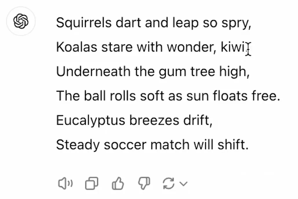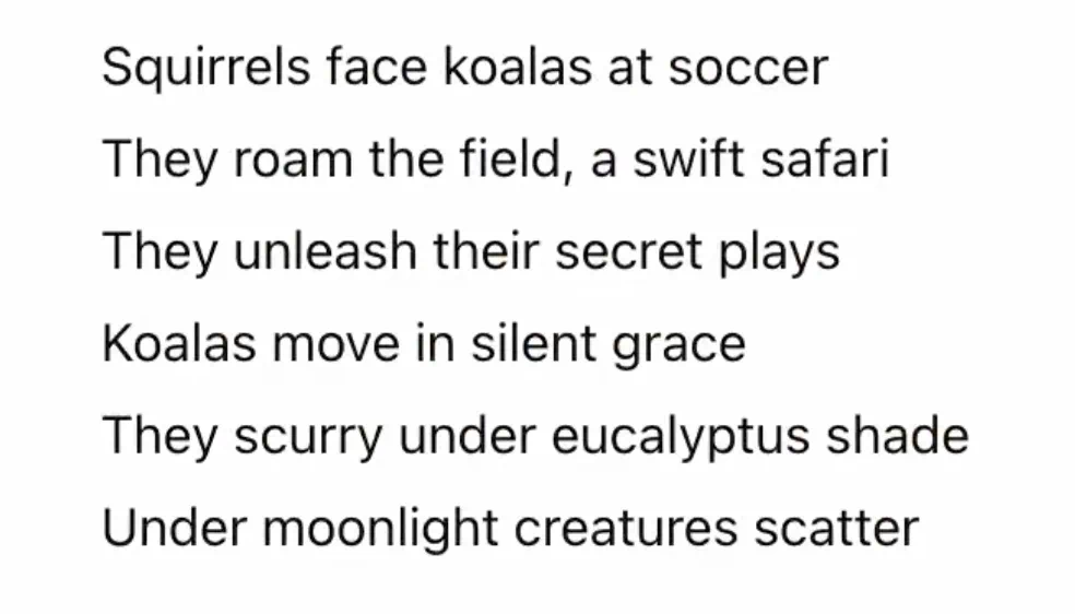 提示词:Write a six line poem about squirrels playing koalas at soccer thatmeets the following constraints:-In line 2, the last word should end with i.-In line 3, the second word begins with "u"-In line 5, the second-to-last word is eucalyptus- In the final line, each word has 2 syllables.写一首关于松鼠和考拉踢足球的六行诗,且符合以下限制条件:- 第二行的最后一个单词需以字母 “i” 结尾- 第三行的第二个单词应以 “u” 开头- 第五行倒数第二个单词是 “eucalyptus”(桉树)- 最后一行的每个单词都有两个音节。