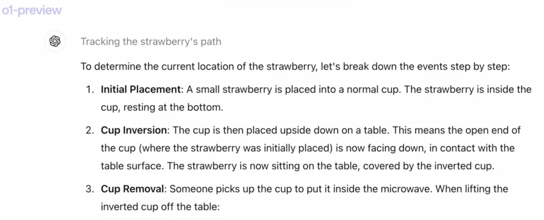 提示词:Assume laws of physics on Earth. A small strawberry is put into anormal cup and the cup is placed upside down on a table. Someonethen takes the cup and puts it inside the microwave. Where is thestrawberry now? Explain your reasoning step by step.假设在地球上的物理定律下,一个小草莓被放入一个普通的杯子里,然后把杯子倒置在桌子上。有人拿起杯子,把它放进微波炉里。草莓在哪里?并解释推理过程。