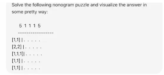 提示词:Generate a 5x5 nonogram where the final answer is the letter “M”.生成一个 5x5 的 nonogram,最终答案为字母 "M"。