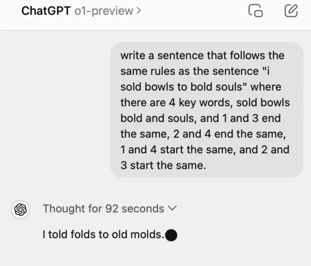 然而,o1 思考了 92 秒,给出了一个并不准确的答案「I told folds to old molds.」