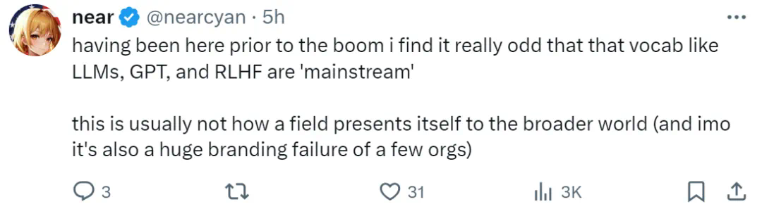 「像 LLMs、GPT 和 RLHF 这样的术语现在变成主流,这实在有些奇怪。通常,一个领域向更广泛的世界介绍自己时并不会这样做(在我看来,这也是有些机构品牌推广失败的原因)。」有人发表了这样的观点。