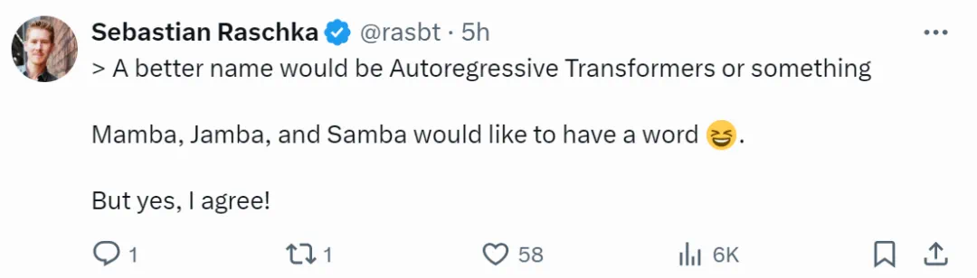 机器学习和 AI 研究员、畅销书《Python 机器学习》作者 Sebastian Raschka 也非常赞同,他表示:如果将 LLM 改为自回归 Transformers 或者其他名字的话,那 Mamba、Jamba、Samba 可以申请加入吗。不管怎样,还是非常赞同 Karpathy 观点。