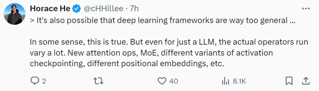 在 Meta 从事 PyTorch 研究的 Horace He 表示:确实,深度学习框架可能在某些方面过于普遍。尽管如此,即便只是针对大型语言模型(LLM),实际运行的操作也有很大的变化。这包括新的注意力操作、混合专家模型(MoE)、不同变体的激活检查点、不同的位置嵌入等。