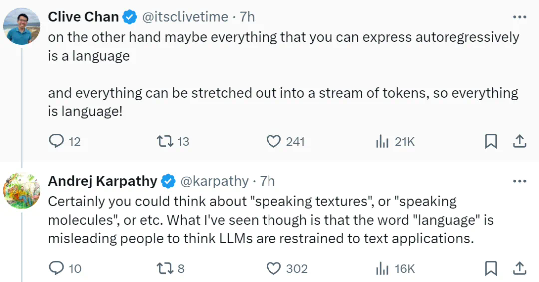 对于这种说法,Karpathy 回复到:当然,你可以想象说话纹理、说话分子等等。但我所观察到的是,语言这个词误导了人们认为大型语言模型(LLM)只限于文本应用。
