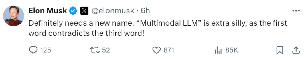 作为前排吃瓜群众的马斯克非常赞同的表示:这绝对需要一个新名字,「多模态 LLM(Multimodal Large Language Models)」是一个特别愚蠢的名字,因为第一个词与第三个词相矛盾!