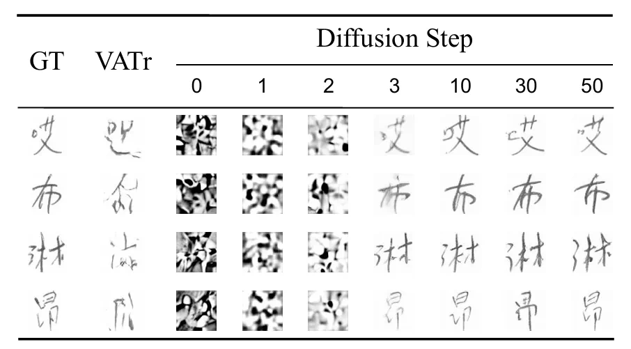 One-DM 在中文和日文实验上的深入分析 为什么 One-DM 在中文和日文实验上远超 GAN-based 的方法?本文对此做了进一步探究。作者认为,GAN-based 方法在较低性能可能源于其基础卷积架构难以处理这些字符的复杂几何结构。相比之下,One-DM 作为 Diffusion-based 方法,将中文和日文等复杂字符的生成过程分解为更简单的步骤。如上图所示,在扩散生成过程的早期阶段,One-DM 首先尝试生成一个粗略的中文手写字符。然后,在条件输入的引导下,模型继续细化书写风格(例如字符形状和笔画颜色),直到合成出令人满意的手写体。