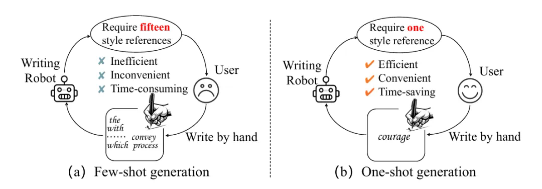 在去年早些时候,机器之心也报道过一个CVPR’23笔迹模仿的工作,名为Disentangling Writer and Character Styles for Handwriting Generation。彼时的笔迹模仿 AI 还需要提供 15 张样本作为风格参考,用户使用起来觉得略显繁琐。在实际应用中,用户更倾向于只需单张样本作为输入的笔迹模仿 AI,因为其更加高效,便捷以及节约时间。