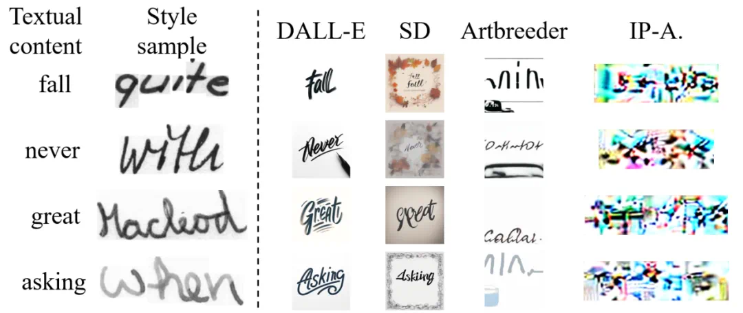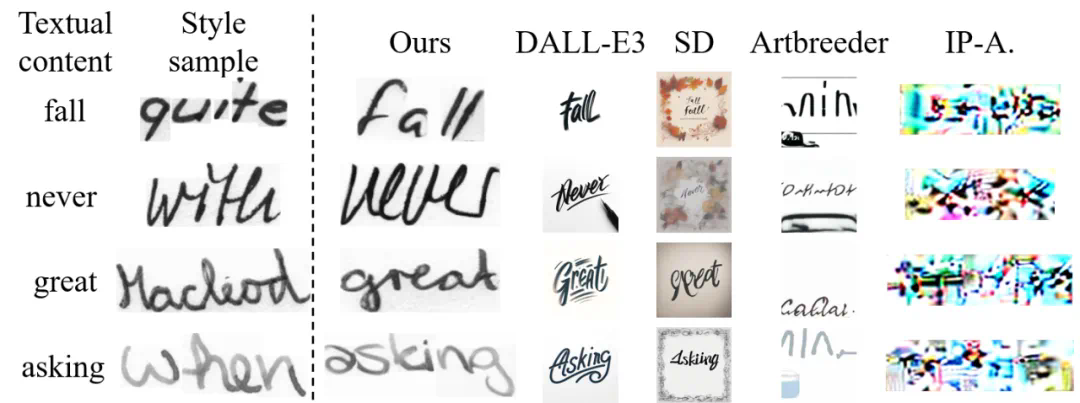 在这篇发表在 ECCV 2024 上的新工作中,研究者们设计了一种能够一眼临摹的手写文字生成方法。该方法仅需单张样本作为风格输入,为用户带来更好的使用体验。在具体介绍该工作之前,我们可以思考一个问题:目前大火的文生图方法和风格迁移方法是在海量的数据上进行训练的,拥有强大的泛化能力,能否可以直接实现一眼临摹?答案是否定的。研究者们挑选了 DALL-E3, Stable Diffusion , Artbreeder , IP-Adapter 等工业方法进行测试,实验显示现有工业方法在手写文字的风格临摹 (墨迹颜色,倾斜程度,字母间的连笔和间隔等) 上离目标还有较大距离,暂时还无法做到一眼临摹。