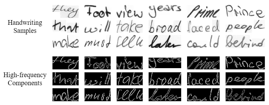 研究动机 研究者发现,由于单张样本图像中存在背景干扰,书写风格模式并不清晰,很难直接从原始的样本图像中提取出准确的书写风格。为了解决上述问题,研究者对样本进行高低频分离,发现书写样本的高频成分中具有清晰的文字轮廓,蕴含着显著的书写风格模式,包含文字的倾斜,字母间距和连笔模式等。受启发于上述观察,One-DM 旨在引入个人笔迹的高频成分来增强用户书写风格的提取。
