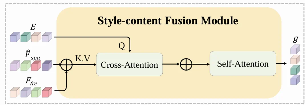 (c) 风格 – 内容的融合摸块 获取了高频和空域风格特征后,如何将风格信息和内容编码器提取出的内容信息注入到扩散模型中,引导后续的文字生成过程呢?One-DM 提出先将内容信息和风格信息融合后再进行注入扩散模型,而不是分开注入。具体来说,所提出的风格 – 内容融合模块包含两个 attention 机制。首先,内容信息E作为 query 向量,合并后的风格信息作为 key & value 向量,在交叉注意力机制中,E动态查询风格信息中与自身最相关的风格特征。然后,将查询出的风格特征和内容信息合并,送入自注意力机制中完成进一步的信息融合。