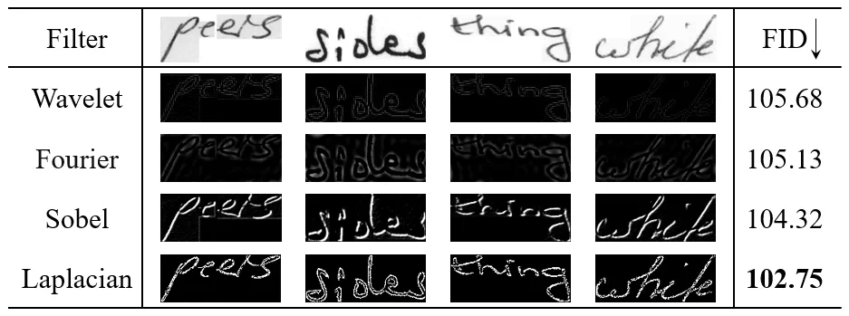 (a) 拉普拉斯风格增强模块 One-DM 提出拉普拉斯风格增强模块来从单张书写样本中高效提取用户的书写风格。首先利用拉普拉斯算子获取原始样本的高频成分。相比其他算子,例如:傅里叶算子,索贝尔算子和小波算子,拉普拉斯算子的优势在于能够提取更加清晰的字符风格模式。随后,在拉普拉斯对比学习损失函数(LapNCE)的引导下,高频风格编码器从高频成分中提取出判别性强的风格模式,用于促进手写文本合成的真实性和多样性。LapNCE 和高频成分是不可分割的整体,与其他直接作用于图像上的对比学习损失函数不同,LapNCE 只有作用在高频成分上才能准确引导风格的提取。