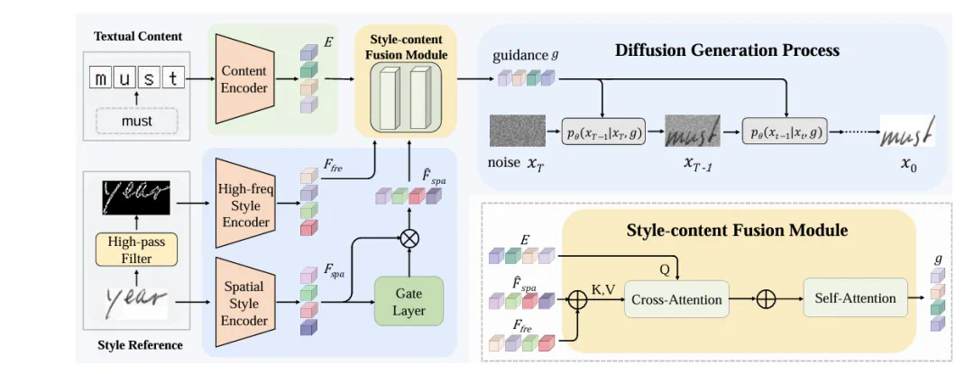 方法框架 One-DM 的整体框架如下图所示,包含高频风格编码器、空域风格编码器、内容编码器、风格 – 内容融合模块和扩散生成模块。首先,One-DM 利用高通滤波器从原始风格参考图像中提取高频成分,其次将高频和原始图像并行输入到高频和空域风格编码器中,分别获得高频和空域风格特征。然后,利用门控机制来自适应过滤空域风格特征中的背景噪声。接着将内容编码器提取的内容特征,高频风格特征和过滤后的空域风格特征送入风格 – 内容融合模块中获得合并后的条件输入。最后,利用该条件输入引导扩散模型合成满足期望风格和目标内容的手写文字。