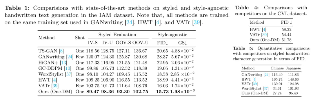 在其他语言上 One-DM 也表现良好。从下图中可以看出,Diffusion-based (One-DM 和 WordStylist) 的方法在生成中文和日文等字符结构复杂的文本时,显著优于 GAN-based (GANwriting,HWT 和 VATr) 方法。而相比同为 Diffusion-based 的 WordStylist,One-DM 在字符细节上更胜一筹。