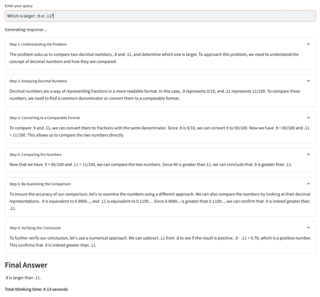 在每个步骤中,LLM 可以选择是继续进行另一个推理步骤,还是提供最终答案。每个步骤都有标题,并且对用户可见。