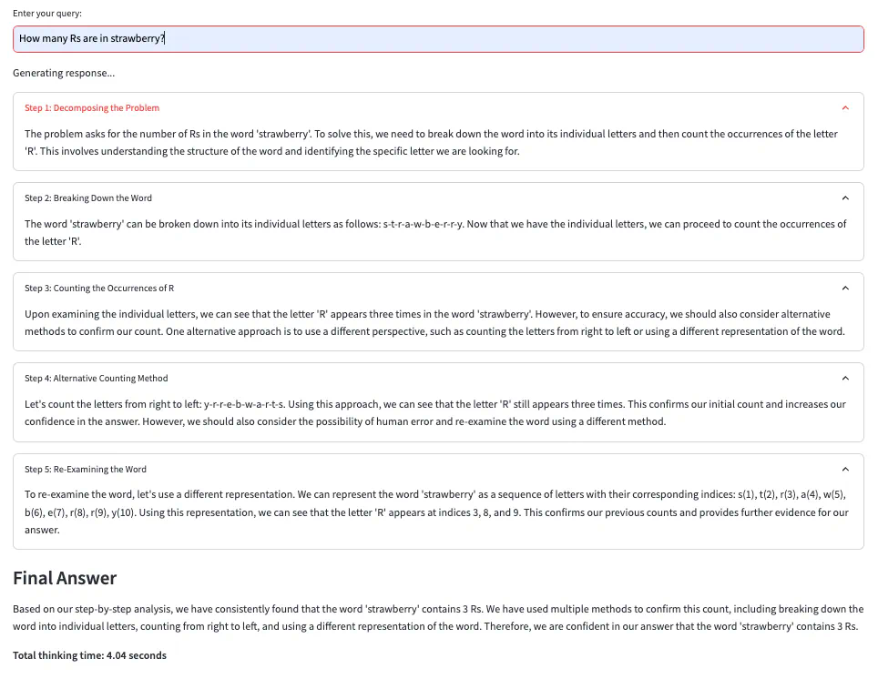 具体来说,Llamaberry 是一个多轮思维链推理系统的实现,其基于运行在 Groq 上的 Llama 3.1 70B 模型。