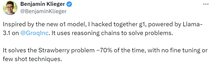 g1 这个项目来自 Benjamin Klieger,他是 Groq 的一位研究者。也因此,g1 同样基于 Groq,并且其也使用了 Llama 3.1 70b 模型。