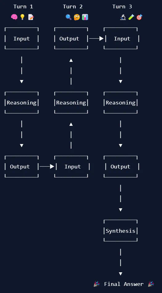 经过三轮思考之后,再让 AI 检视其所有思考并得出一个合理的最终答案。这就像是让专家讨论问题,然后编写最终报告。