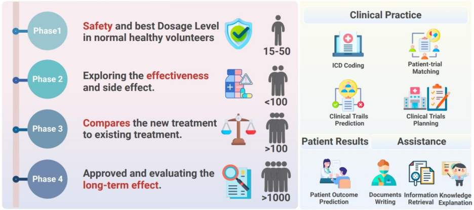 图示:临床试验。这张图表左侧展示了临床试验的不同阶段,右侧展示了大语言模型(LLM)在这些阶段中的应用。(来源:论文)