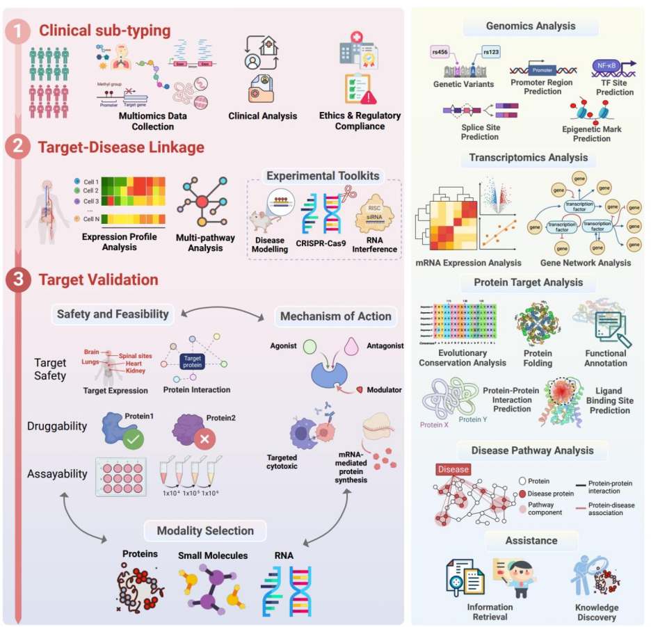 通过多组学数据的收集(如基因、蛋白质、代谢组等),结合临床分析和伦理法规要求,对疾病进行分型。目的是更好地理解疾病的异质性,从而为后续的靶点发现打下基础。