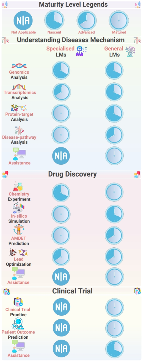 图示:下游任务中的 LLM 成熟度评估。这张图表展示了两种类型的大语言模型的应用成熟度:科学大语言模型(Specialized LMs)和一般大语言模型(General LMs),分别在理解疾病机制、药物发现和临床试验中的应用情况。应用成熟度分为四个等级:新生期、进展期、成熟期以及不适用(N/A)。(来源:论文)