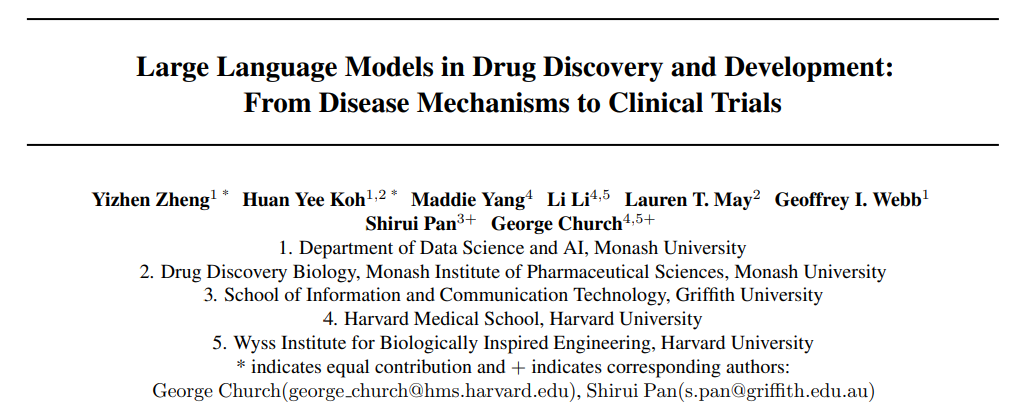 近日,哈佛大学、莫纳什大学和格里菲斯大学(Griffith University)组成的研究团队,发表最新综述《Large Language Models in Drug Discovery and Development: From Disease Mechanisms to Clinical Trials》。