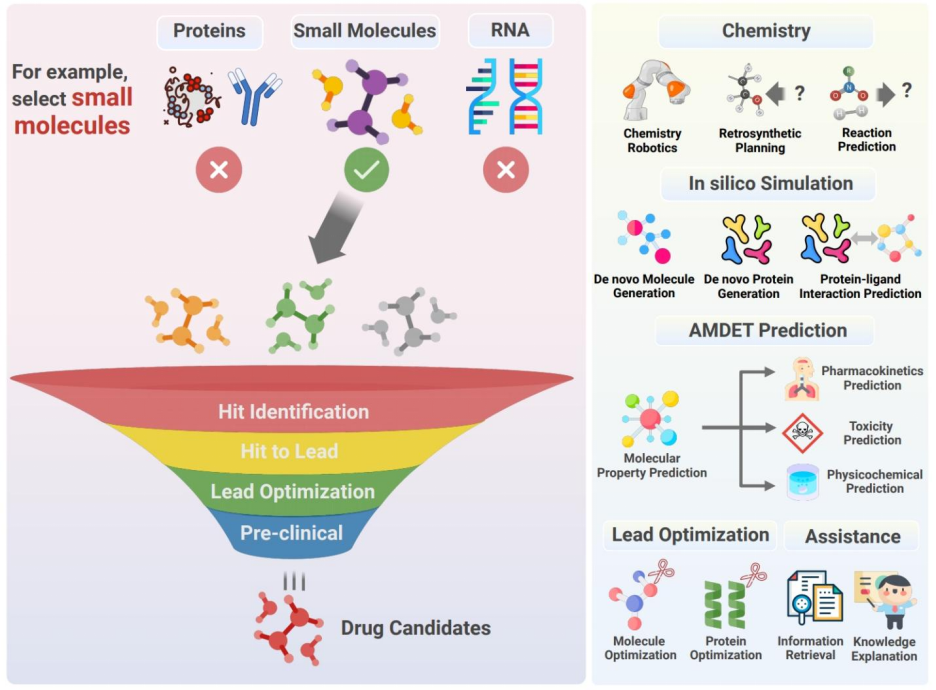 本文阐述大语言模型可以在理解疾病机制、药物发现和临床试验三个药物发现的基本阶段展现出重要潜力。
