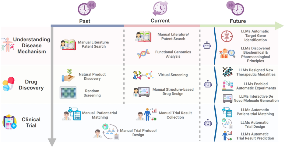 首先,本文展示了过去、现在的药物研发与临床试验中的过程并展现了大语言模型(LLMs)未来在这些阶段的潜在应用。