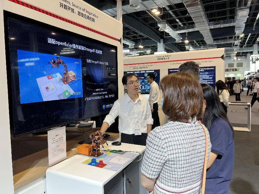 此外,搭载OrangePi AIpro开发板的OPi 智能机械臂作为开放原子开源基金会的AI展品同时亮相于HC大会。此款机械臂能对积木颜色进行识别,将积木搬运到对应区域,可应用于垃圾分拣及工业、物流、医疗领域。