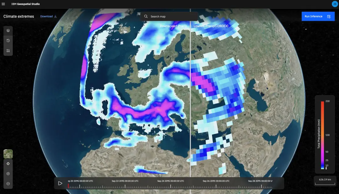 IBM 发布了降尺度模型,作为 IBM Granite 系列的一部分。它采用不同分辨率和类型的数据,例如温度和降雨量,并将其放大多达 12 倍。在传统气候模型中,导致山洪暴发的强降雨以前只能在 150 平方公里的范围内观察到,通过降尺度,现在可以在 12.5 平方公里的范围内看到。