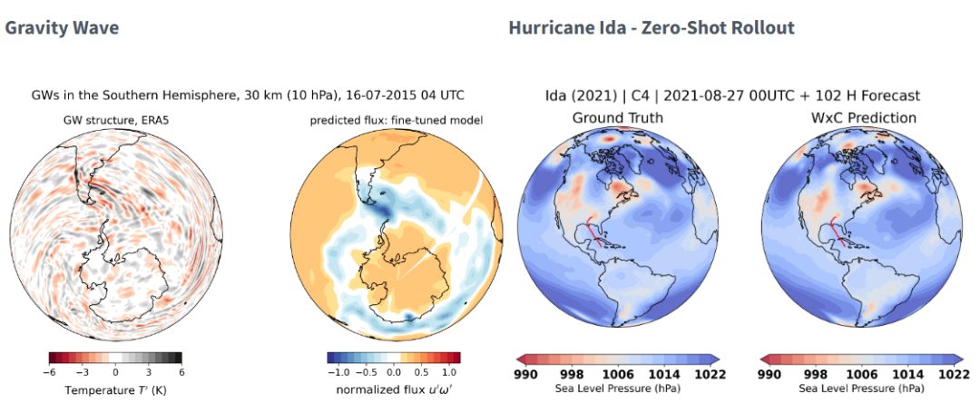 研究还尝试了不同的损失函数,例如,从预测模拟器的损失函数中删除特定于任务的时间方差,并将其替换为与任务无关的气候学方差。Prithvi WxC 的验证从用于重建和预测的零样本评估扩展到下游任务,例如天气和气候模型的降尺度、飓风轨迹的预测和大气重力波通量参数化。