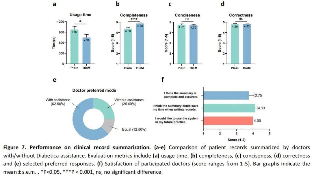 研究团队发现,使用 Diabetica 协助撰写病历的医生,完成病历的时间平均缩短了约 23%。同时,在病历的完整性评分上,使用 Diabetica 辅助的病历显著高于未使用模型的情况。