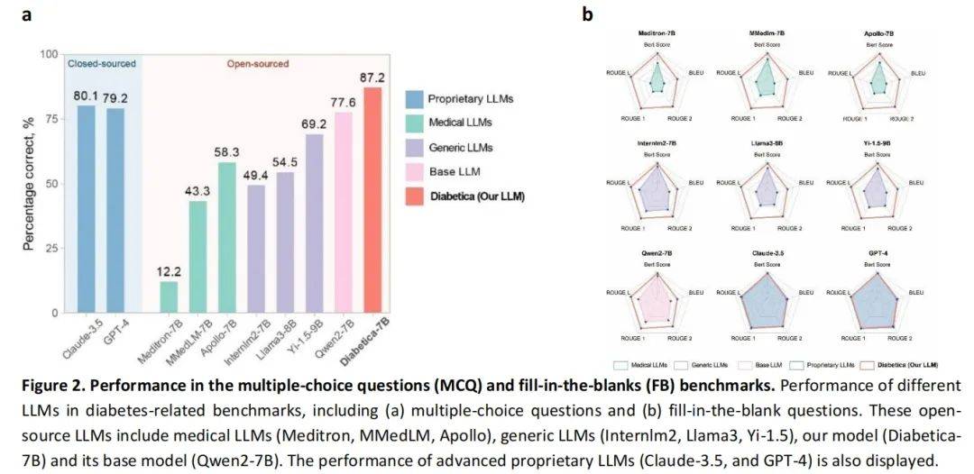 在模型开发方面,团队采用了开源大模型 Qwen2-7B-Instruct 进行微调。为了全面评估 Diabetica 的性能,研究团队设计并构造了多个针对糖尿病领域的评估基准,包括多项选择题测试、填空题测试和开放式问答测试。
