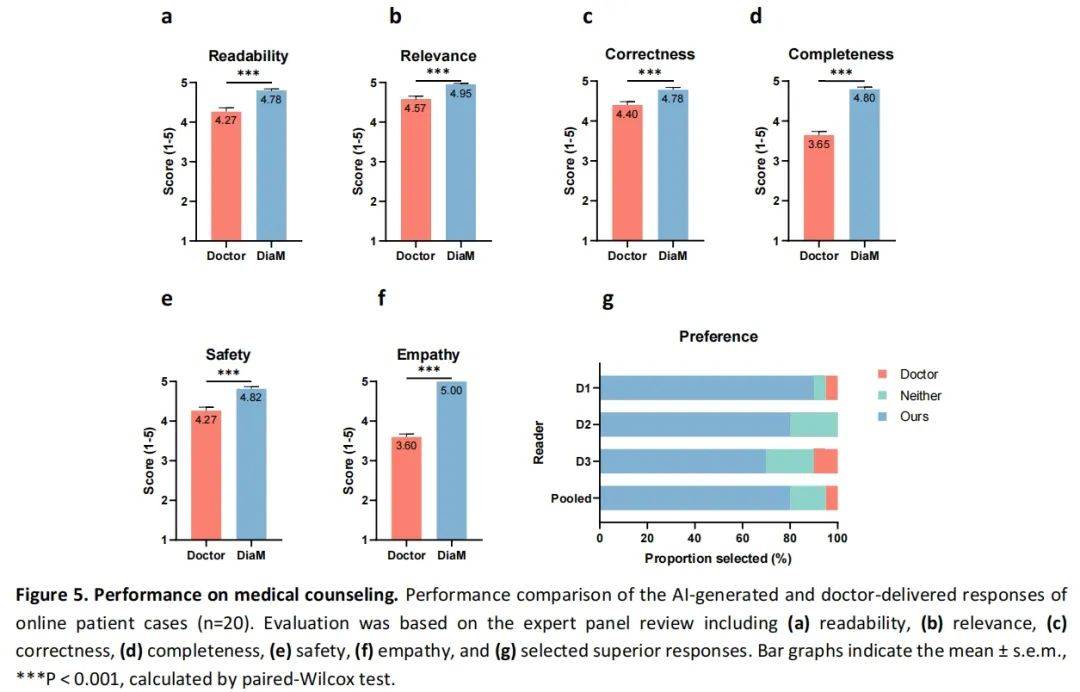 结果显示,Diabetica 的回答在可读性、相关性、准确性、完整性、安全性和同理心等多个维度的表现均超过了人类医生的回答。