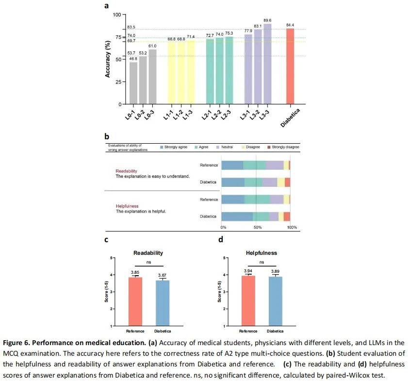 同时,Diabetica 不仅能够给出正确答案,还能为每道题目提供详细的解释。研究团队将模型生成的解释与标准教科书的解释进行比较,发现 Diabetica 的解释在可读性和帮助性方面与教科书相当。