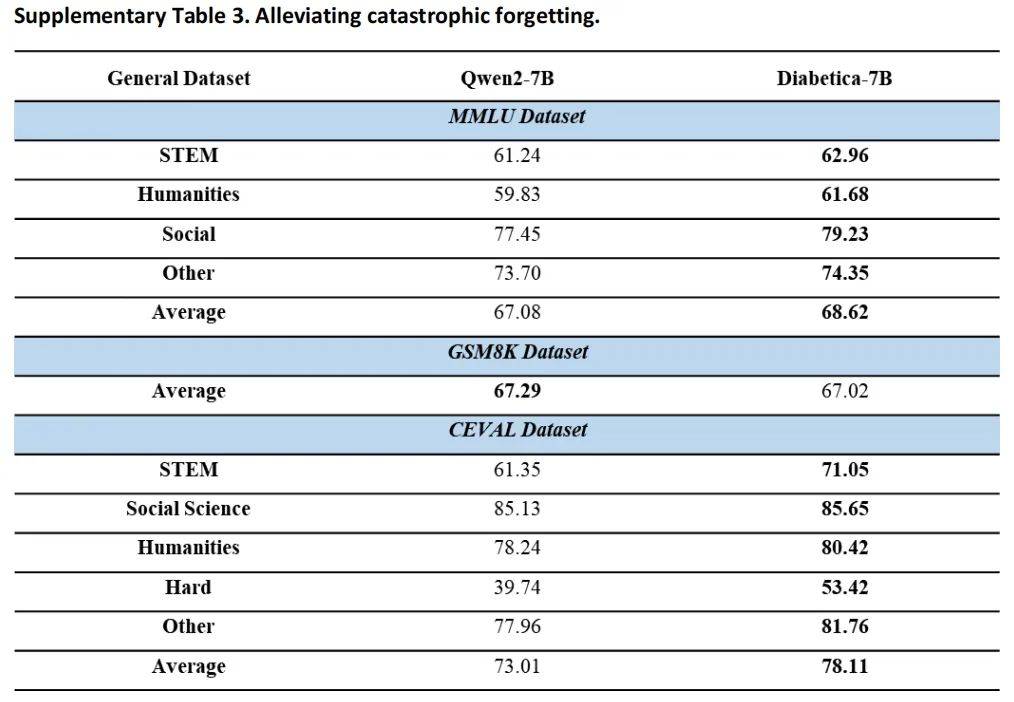 如下图所示,团队的实验结果发现,与训练之前相比,Diabetica 在 GSM8K 的分数仅下降 0.27 分,在 MMLU 和 C-Eval 上甚至还有所提升。这种自蒸馏的训练方法使得 Diabetica 不仅加深了对糖尿病专业知识的理解,也极大程度地保留了基础模型的通用语言理解能力。
