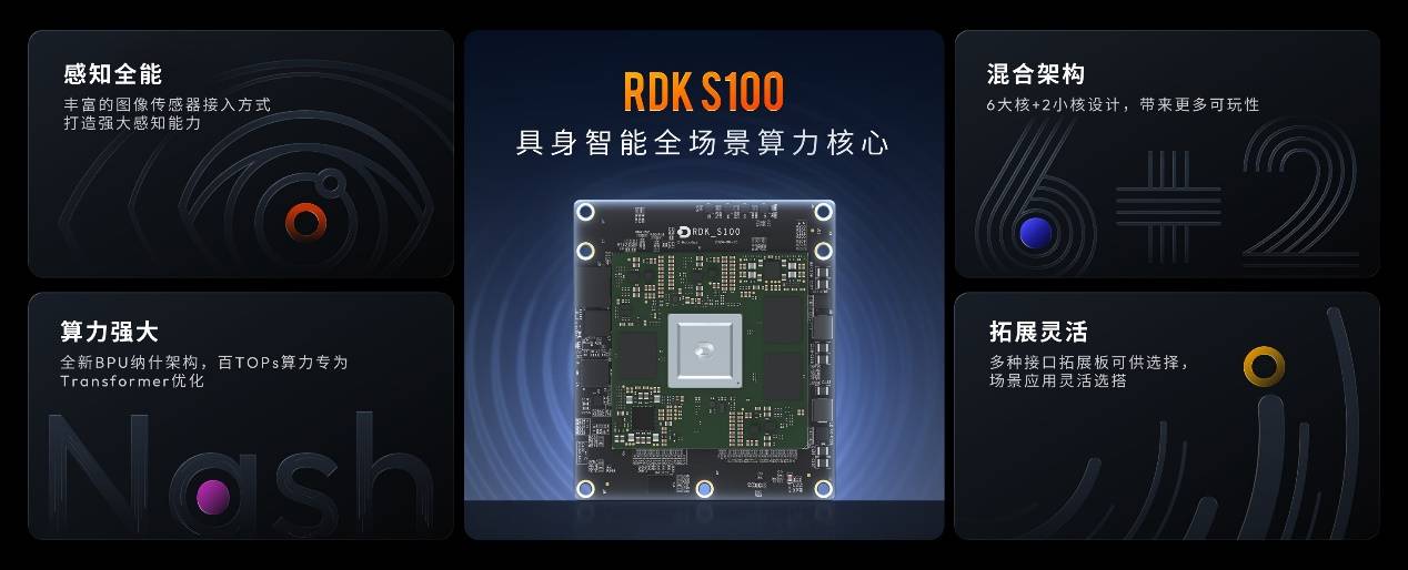 RDK S100是面向具身智能前沿创新与应用突破的全场景算力核心,基于新一代BPU纳什架构设计,拥有百TOPs级算力,专为大参数Transformer优化,可以满足人形机器人、仿生机器人等具身智能应用场景对感知精度和泛化能力的高阶需求。RDK S100还提供丰富的图像传感器接入方式和多种接口拓展板,为具身智能机器人的开发提供灵活拓展性。
