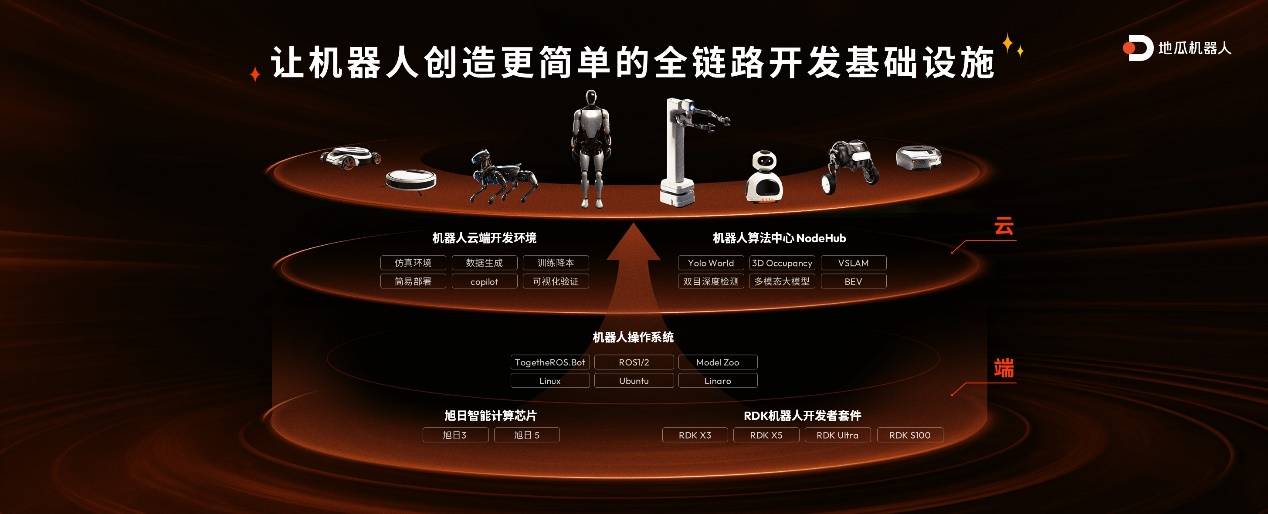以不断迭代进化的智能计算芯片为核心,地瓜机器人RDK一站式智能机器人开发者套件全家桶在本次活动上全面亮相。横向覆盖从消费级机器人,到商清、巡检、AMR,再到人形/四足机器人乃至前沿科研的全场景需求;纵向配套RDK OS + NodeHub + RDK Studio + Cloud的全链路机器人开发平台,全方位助力机器人开发与规模化落地。