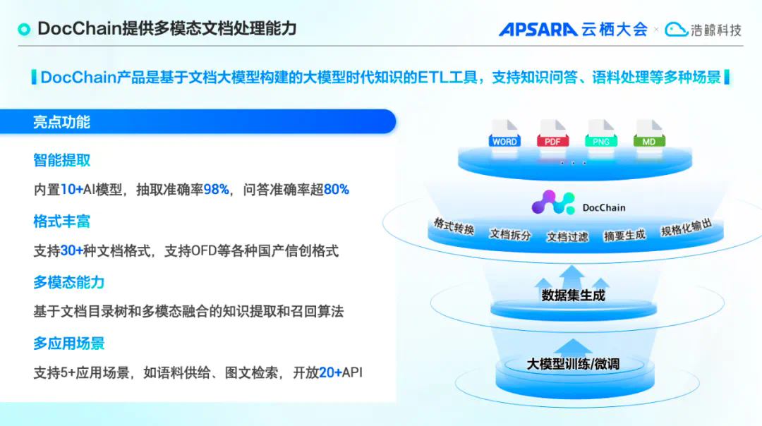 为深度赋能企业用户,浩鲸科技依托先进的鲸智文档大模型,匠心打造了多模态文档工具链 ——DocChain。该产品不仅实现了企业文档向宝贵知识资产的转化,更构建了一个集文档知识精准提取、高效检索与智能问答对话于一体的大模型知识服务平台。DocChain 以其卓越的多模态处理能力、广泛的文档格式兼容性和极致的性能优化,成为企业文档处理领域的得力助手。
