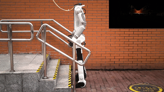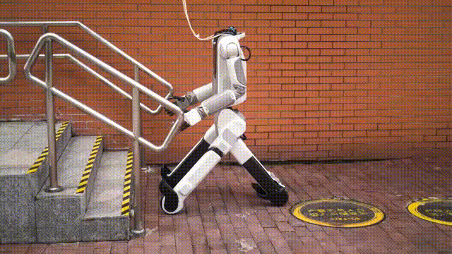 走到楼梯跟前,「小五」会从四轮运动状态调整为四足站立姿势,再伸长腿,迈步上楼。