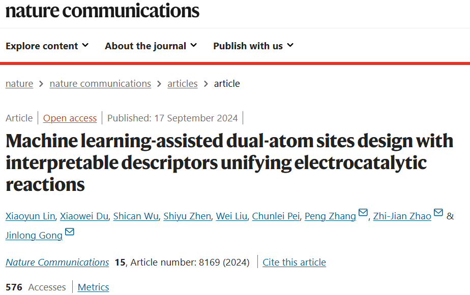 相关研究以「Machine learning-assisted dual-atom sites design with interpretable descriptors unifying electrocatalytic reactions」为题,于 9 月 17 日发表在《Nature Communications》上。