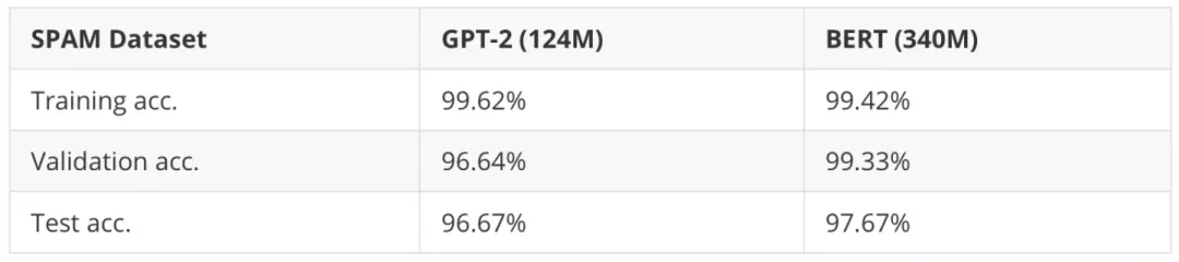 说到 BERT,你可能想知道它在分类任务上与类 GPT 模型的性能比较如何?简单来说,在垃圾邮件分类任务上,更小的 GPT-2(124M)与更大 BERT(340M)的性能类似,具体如下表 3 所示。