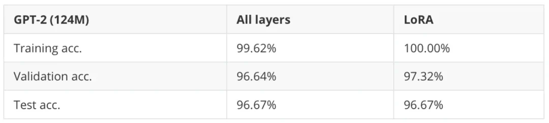 可以看到,完整微调(所有层)和 LoRA 在数据集上获得了相似的测试集性能。